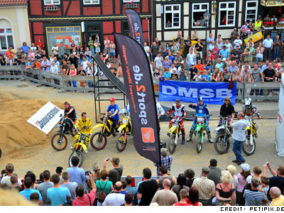 Am vergangenen Samstag traf sich die Deutsche Freestyle Motocross Szene zum zweiten Contest der Deutschen POLO Freestyle Motocross Meisterschaft im Mecklenburgischen Sternberg. Der MC Sternberg hatte als örtlicher Veranstalter eingeladen und einen perfekten FMX Track auf dem Marktplatz hingezaubert. Über drei Rampen mit 20 und 17 Meter Distanz sowie dem Kicker konnten die Athleten ihre Tricks auspacken, um dann auf dem Landehügel direkt vor dem Rathaus zu landen.