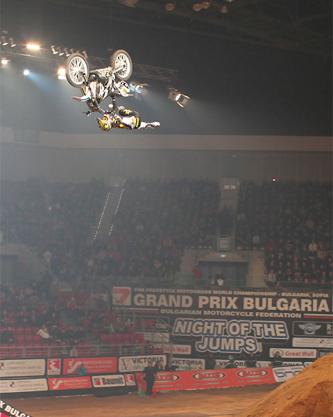 Sofia, 15th December 2012: All hell broke loose on Saturday in Bulgaria’s capital Sofia as the freestyle motocross riders came together in the Armeec Arena for the final competition in this year’s NIGHT of the JUMPS / FIM Freestyle MX World Championship series. The FMX riders fought it out for the last time this year in front of more than 9,000 fans.